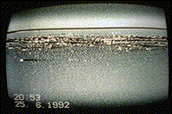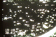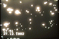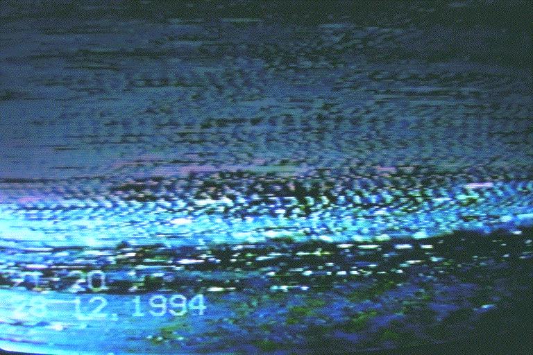 have its reason in that the receiver is a prototype. The pictures are filmed with a videocamera targeted against the monitor attached to the receiver. This because the deflection frequencies of the monitor connected to the receiver are not 100% compatible with normal videostandard. The horisontal and vertical frequencies belonging to our videostandard is transmittet through the hyperspace to those at the other end to tell them about the format we like to receive the signals. The videosignals who comes back are not always totaly within this format so a adjustment of the deflection frequencies of the monitor is nessesary. This is the reason why the pictures have a timestamp on them. Then it's used a normal photo camera to photograph the TV screen showing the video with the pictures. This photographs are then