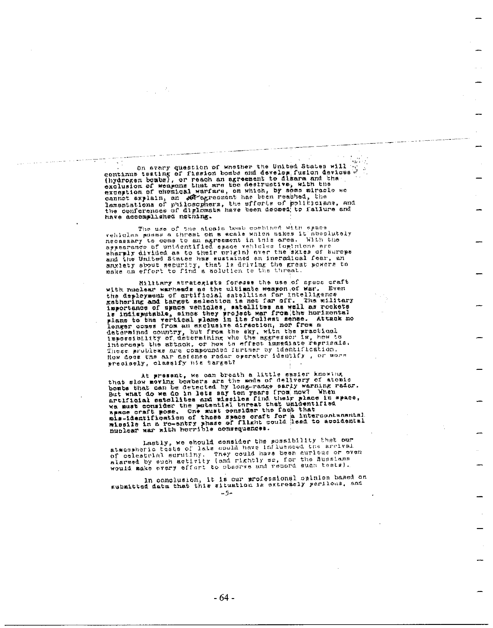 With the types of weapons currently in the covert arsenal — weapons more fearsome even than thermonuclear devices — there is no possibility of a survivable conflict. Yet in the darkness of secrecy, actions have been taken on behalf of every human that may endanger our future. Only a full, honest disclosure will correct this situation. It is not possible for me to convey in words the urgency of this.